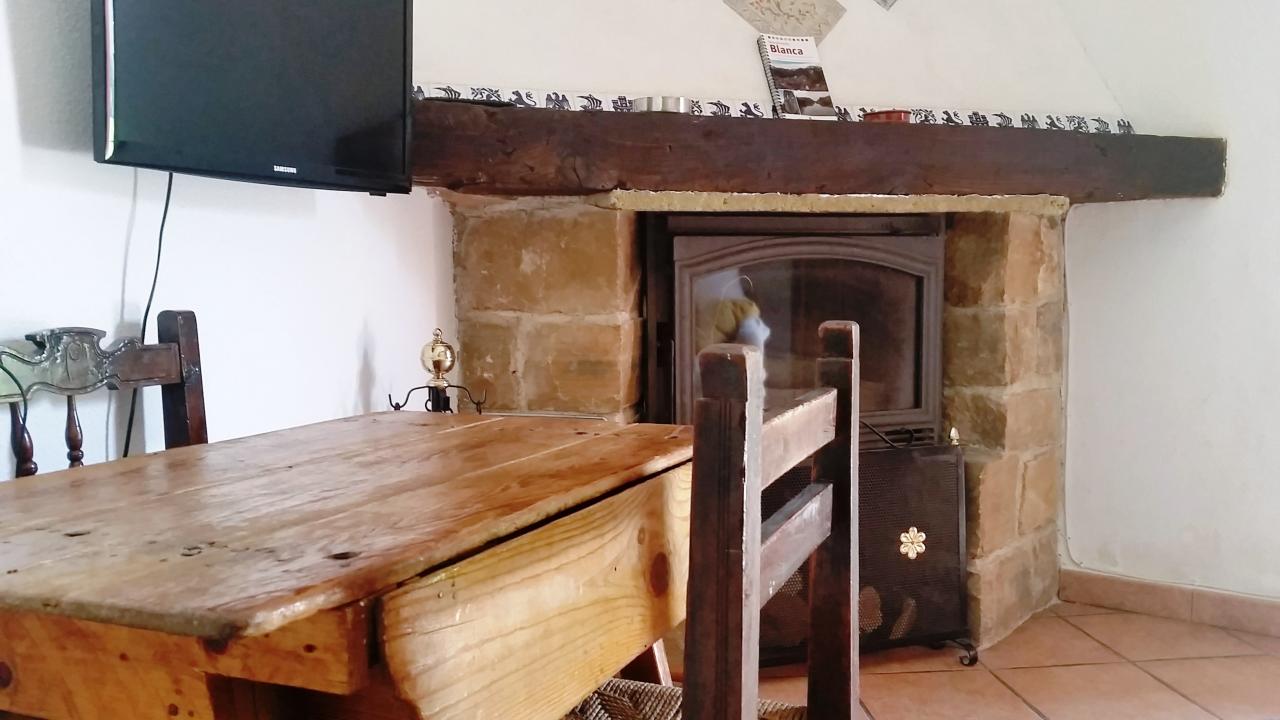 - Sala de estar con sofá cama, televisión y chimenea de leña.