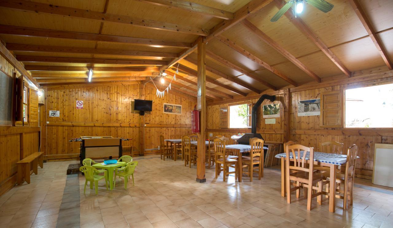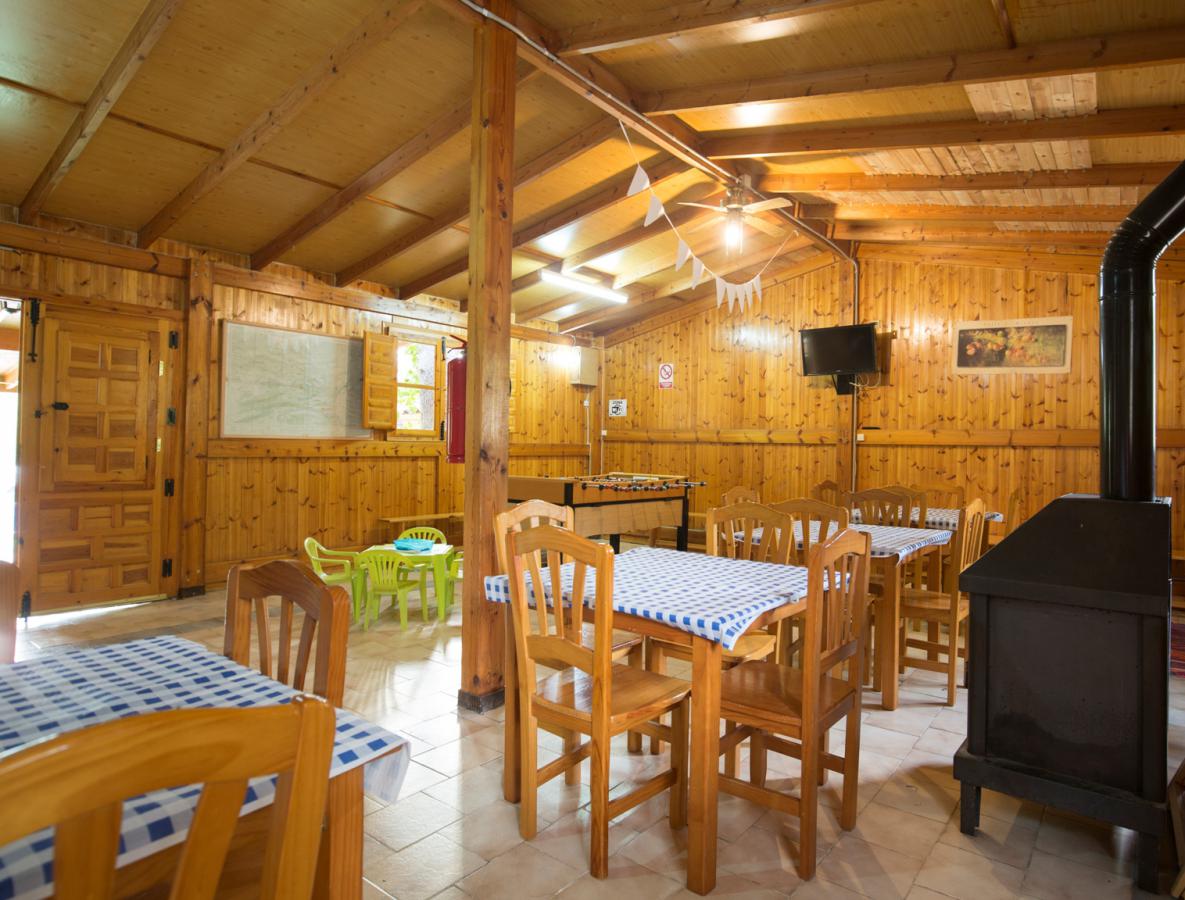 Dentro de las zonas comunes destaca el salón-comedor. Se trata de un área WIFI donde reunirse para ver la televisión, jugar al futbolín, comer, etc. También hay un arcón frigorífico de uso público y chimenea en este espacio. Desde aquí hay vistas tanto al parque como a la piscina.