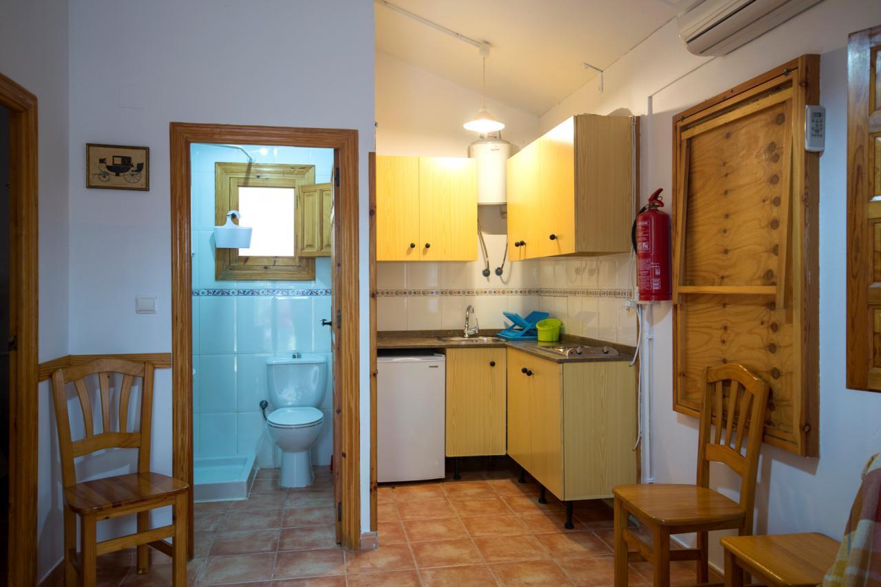 En la cocina encontrarás una nevera bajo encimera, microondas, dos fuegos de cocina eléctricos, tostadora, cafetera italiana y menaje básico de cocina. Hay una mesa plegable para comer bajo el aire acondicionado.
