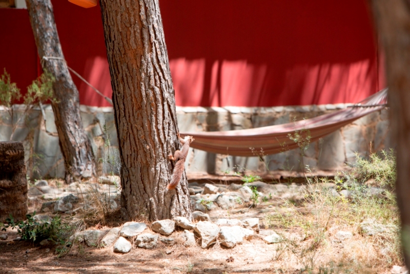 Todo ello se encuentra en una finca de 20.000 m2 con abundante vegetación y jardines, donde a diario corretean las ardillas en busca de piñas y diversas especies de aves, que nos permiten disfrutar del contacto con la naturaleza, lo que hace que el lugar sea perfecto también para aquellos que viajan con niños.
